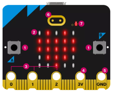 ![]() | 1. Nút nhấn (Buttons) 2. Led và cảm biến ánh sáng 3. Pin - GPIO 4. Pin 3V 5. Pin GND 6. Cảm biến chạm 7. Microphone |