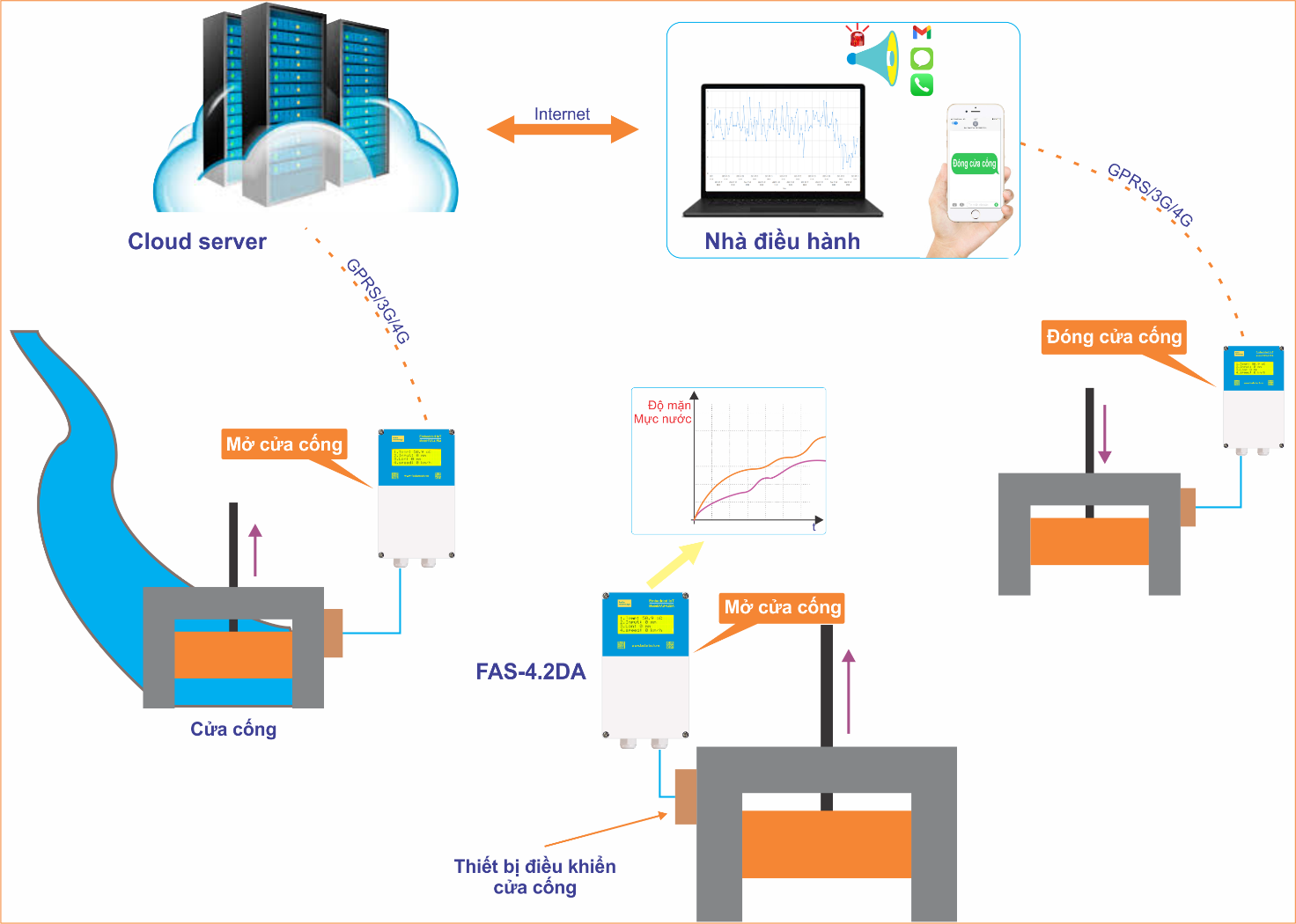 - Phương pháp thứ ba là hệ thống của Fasfartech sẽ tự động điều khiển để đóng mở cửa cống thông qua việc phân tích dữ liệu từ thiết bị giám sát, và thiết bị giám sát ở cửa cống sẽ ra lệnh điều khiển sự đóng mở của cửa cống.
