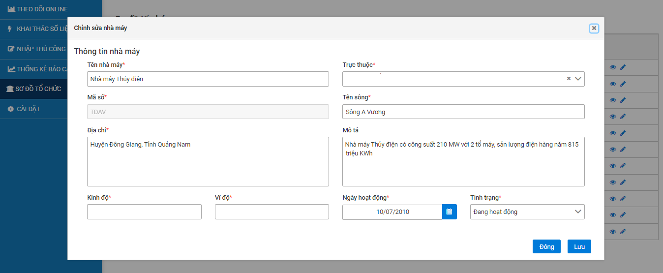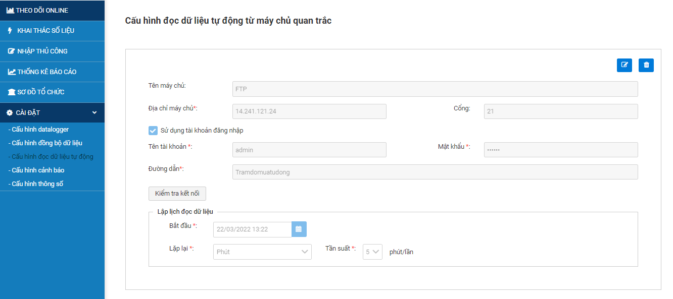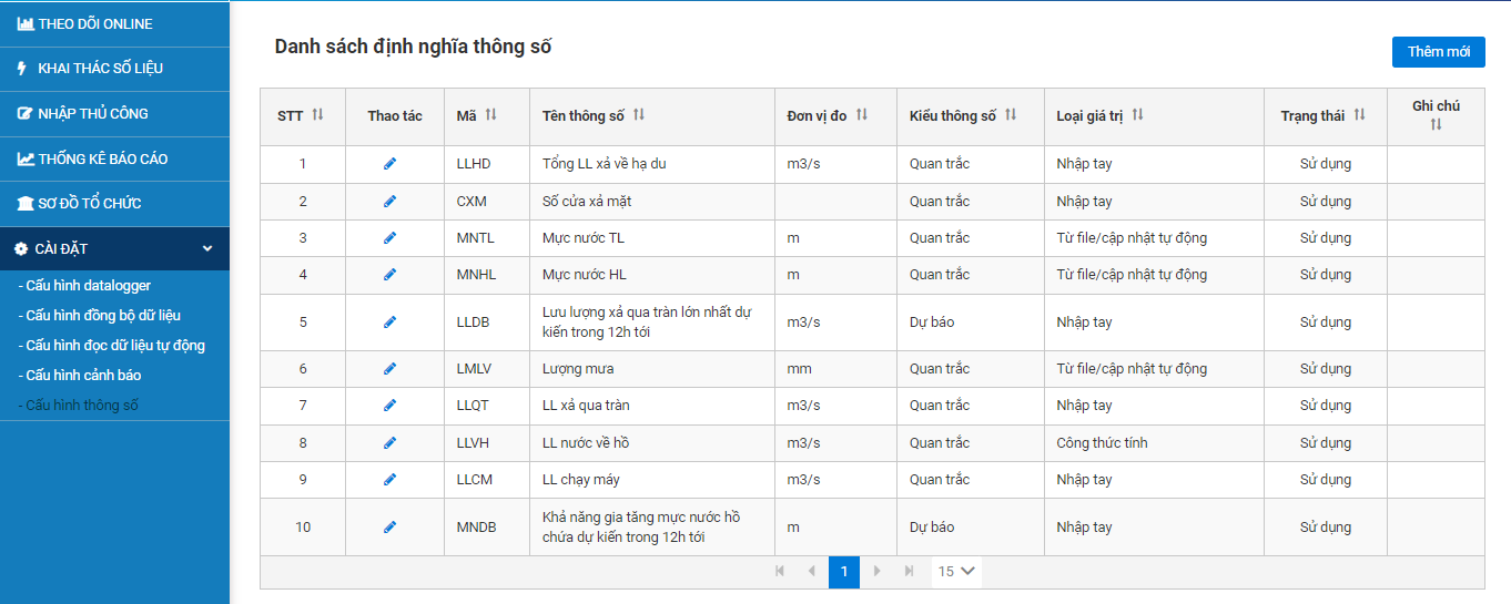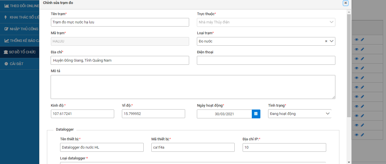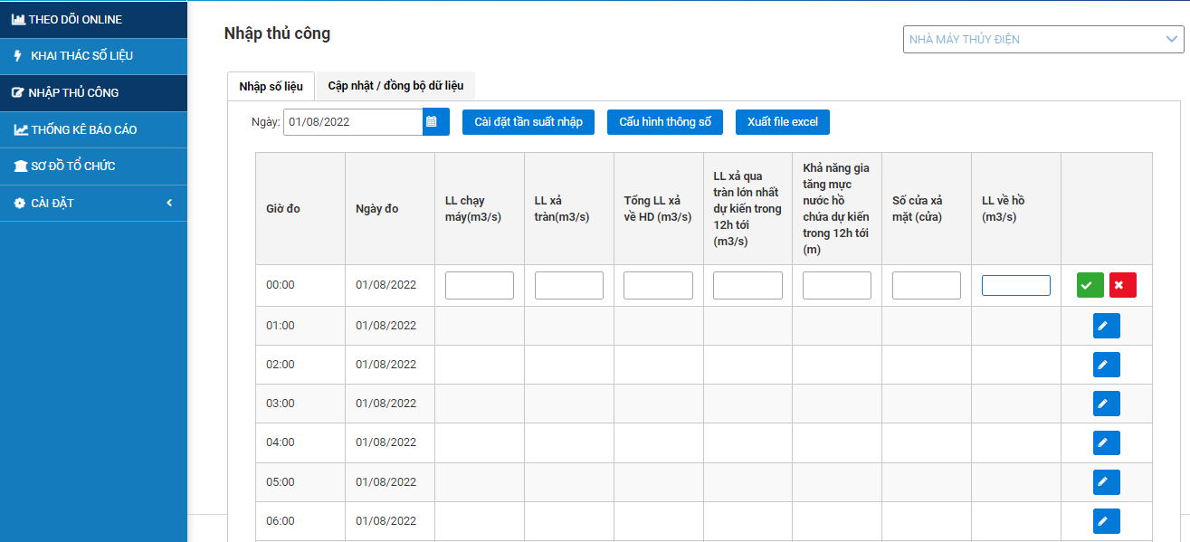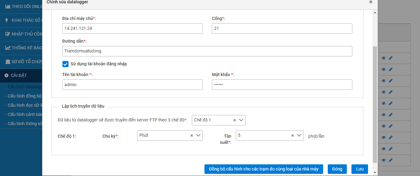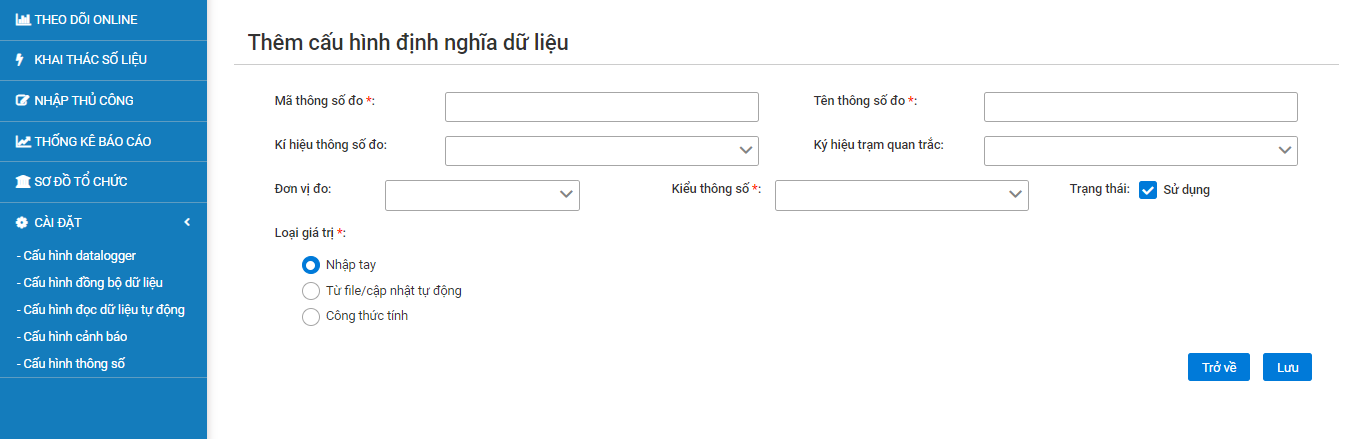 Ngoài ra trên phần mềm còn cho chúng ta nhập số liệu kiểu thủ công cho từng thông số của trạm quan trắc. Có thể cài đặt được tần suất nhập số liệu, cấu hình thông số và tải file dạng excel về máy tính.