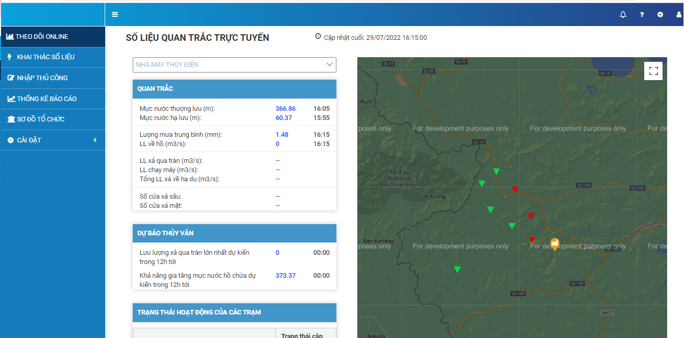 Trên bản đồ sẽ hiển thị vị trí của từng trạm quan trắc. Khi trạm nào truyền dữ liệu lên, vị trí của trạm đó sẽ có màu xanh, trạm nào không truyền sẽ có màu đỏ, giúp người quản lý nắm bắt tình hình truyền dữ liệu của các trạm được dễ dàng, nhanh chóng.