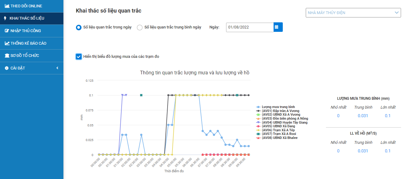 Trên phần mềm sẽ hiển thị dữ liệu của các trạm bằng biểu đồ, cũng có thể chọn để hiển thị dữ liệu của 1 trạm đo.
