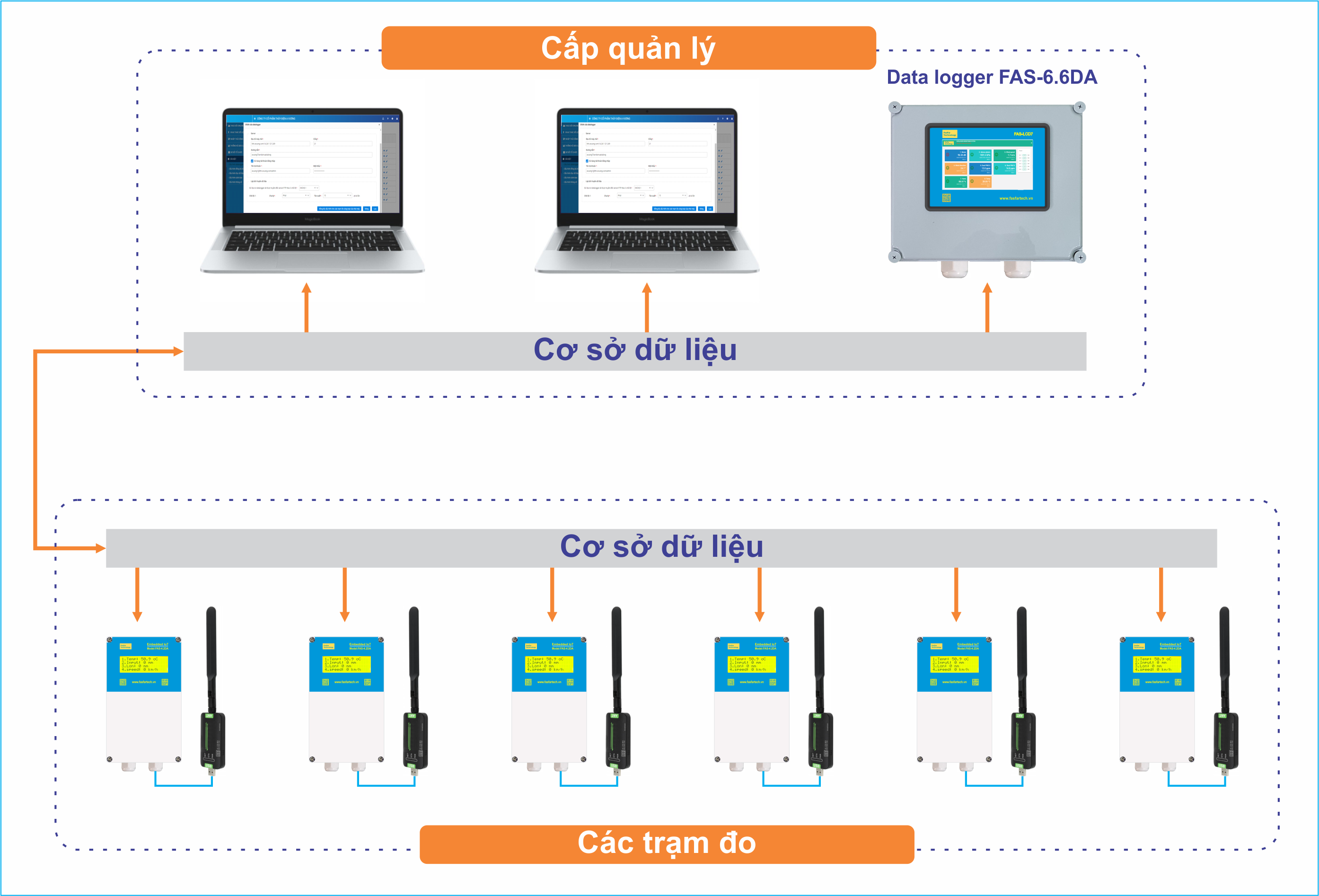 Tại các trạm đo, data logger FAS-4.2DA sẽ truyền dữ liệu lên cơ sở dữ liệu đám mây thông qua mạng 3G/4G. Phần mềm quản lý tập trung sẽ thu thập dữ liệu của các trạm thông qua mạng internet, và quản lý dữ liệu của rất nhiều trạm data logger.