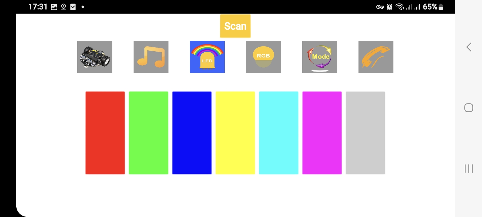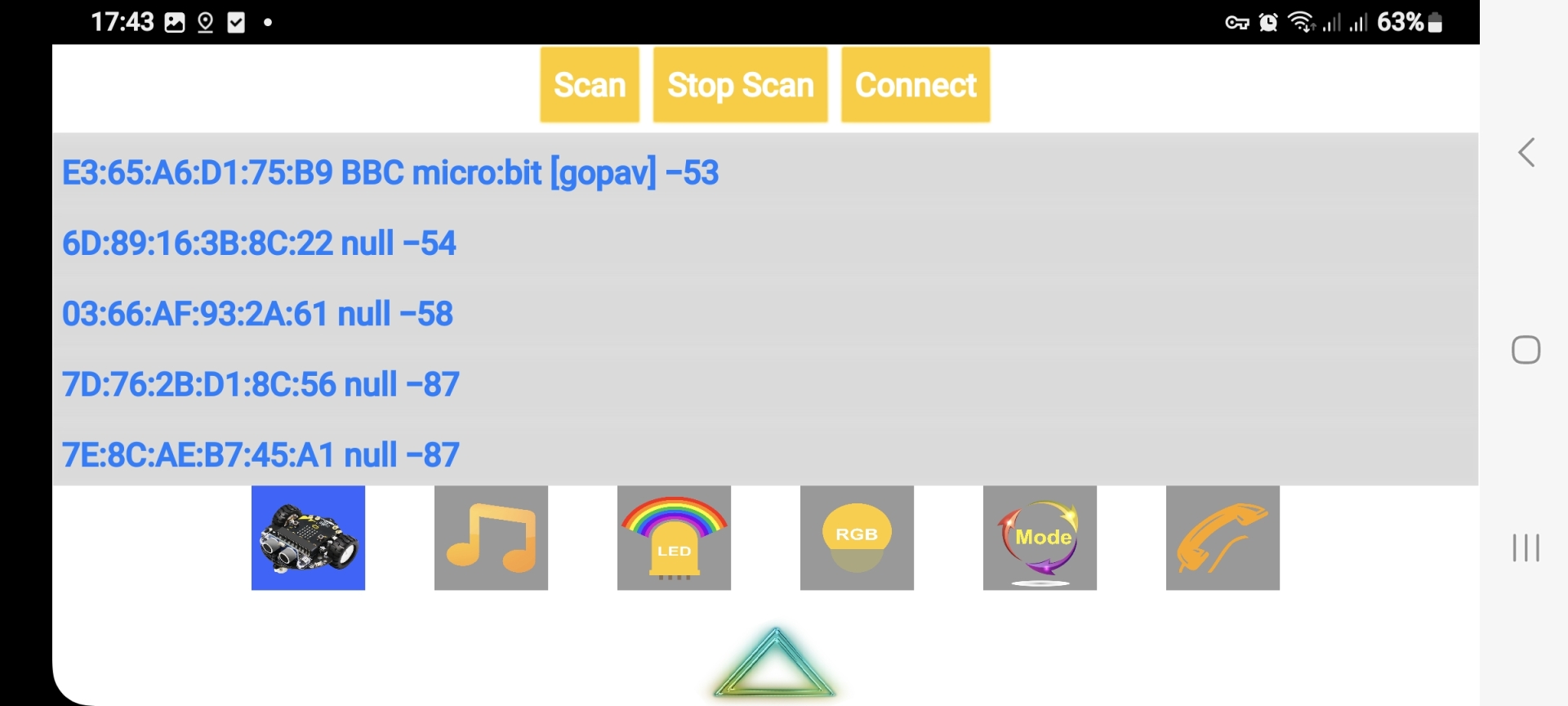 Mở Bluetooth của điện thoại, mở App Tiny bit. Sau đó nhấn vào "Scan", giao diện sẽ hiển thị các thiết bị có kết nối Bluetooth, khi thấy thiết bị có tên là Micro:bit hiện lên, chúng ta nhấn vào "Stop Scan" và nhấn chọn vào dòng thiết bị Micro:bit để kết nối Bluetooth với Robot Tiny bit.