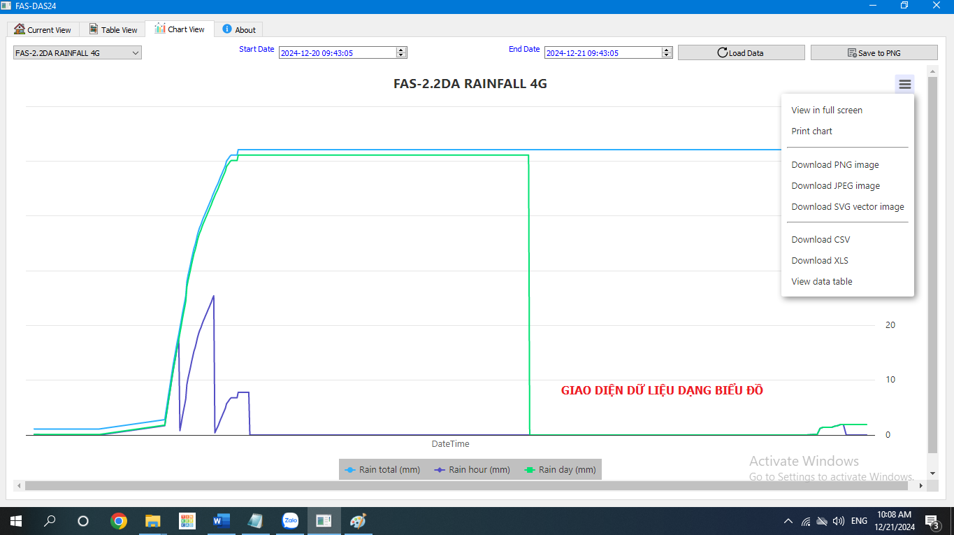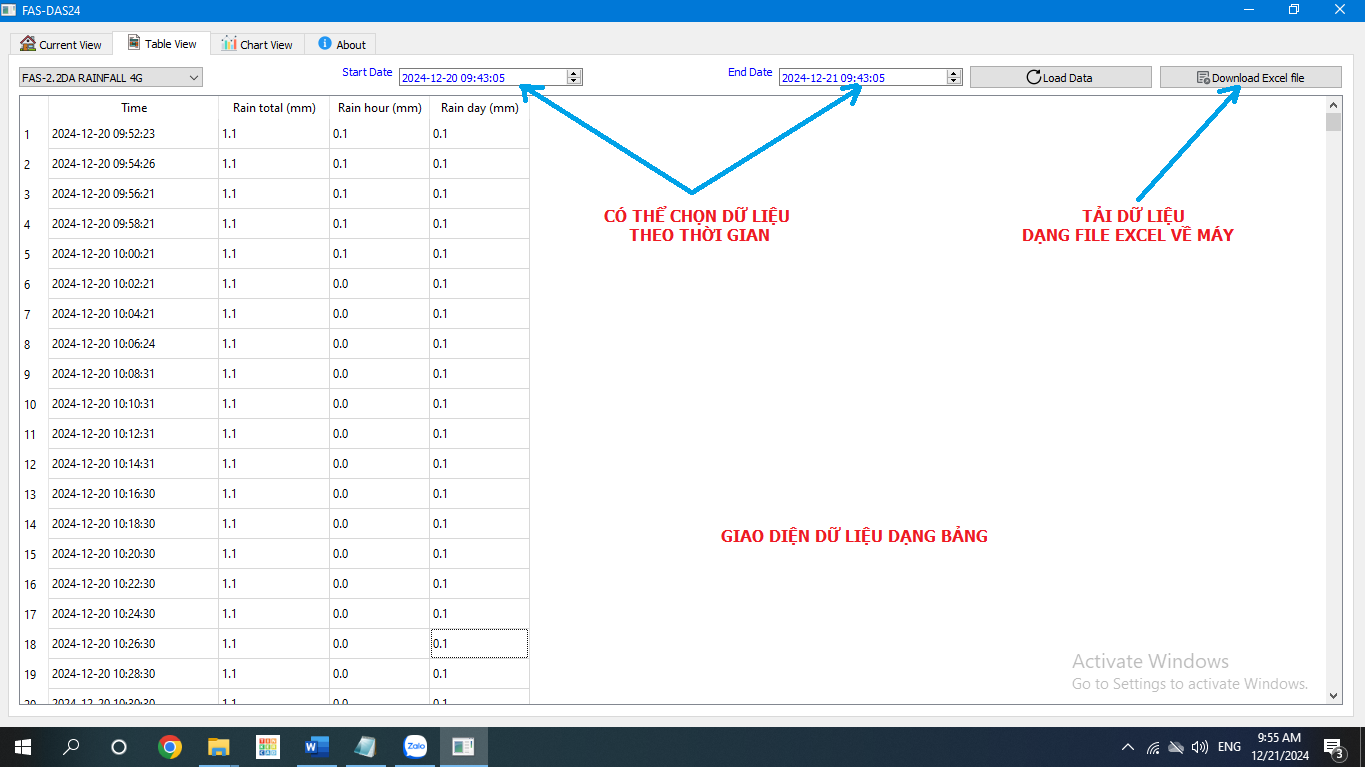 - Thu thập, lưu trữ và truyền dữ liệu đo mưa: Lượng mưa theo giờ, trong ngày (24 giờ), Đo lượng mưa giờ trước, ngày hôm trước, lượng mưa tích lũy.