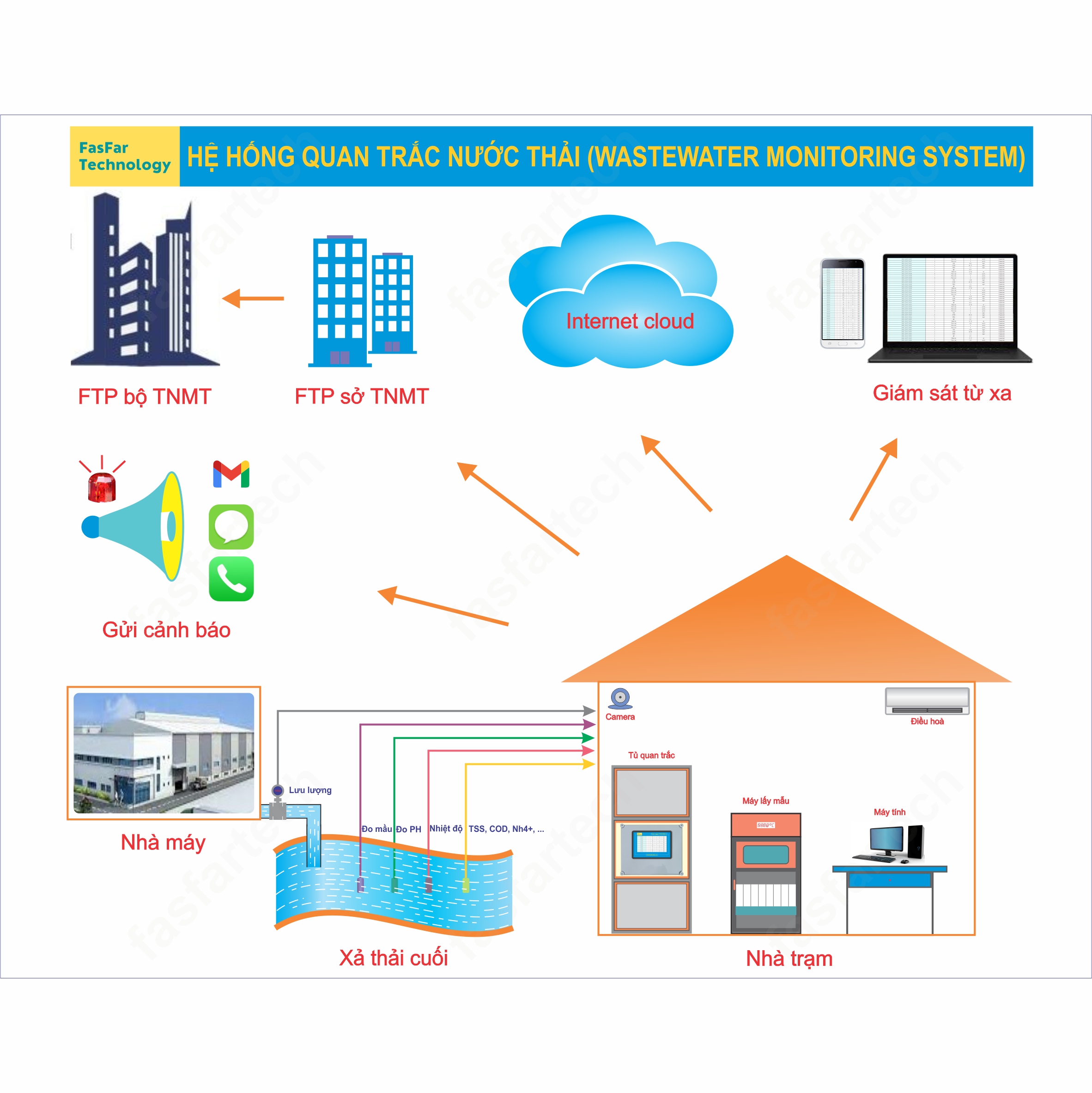 - Dữ liệu đo được gửi về Sở Tài Nguyên Môi Trường với tần suất có thể cài đặt được từ 1-99 phút.