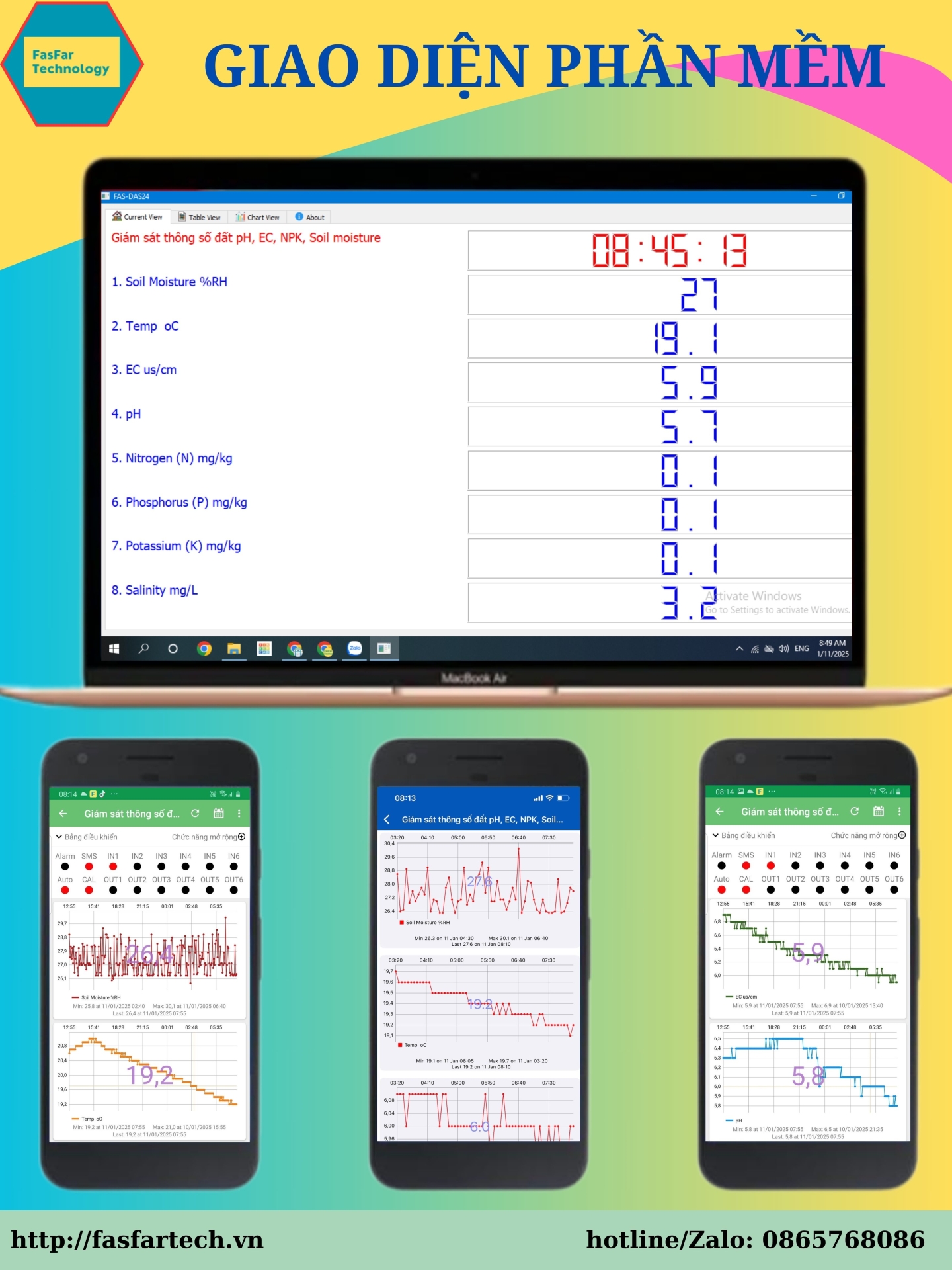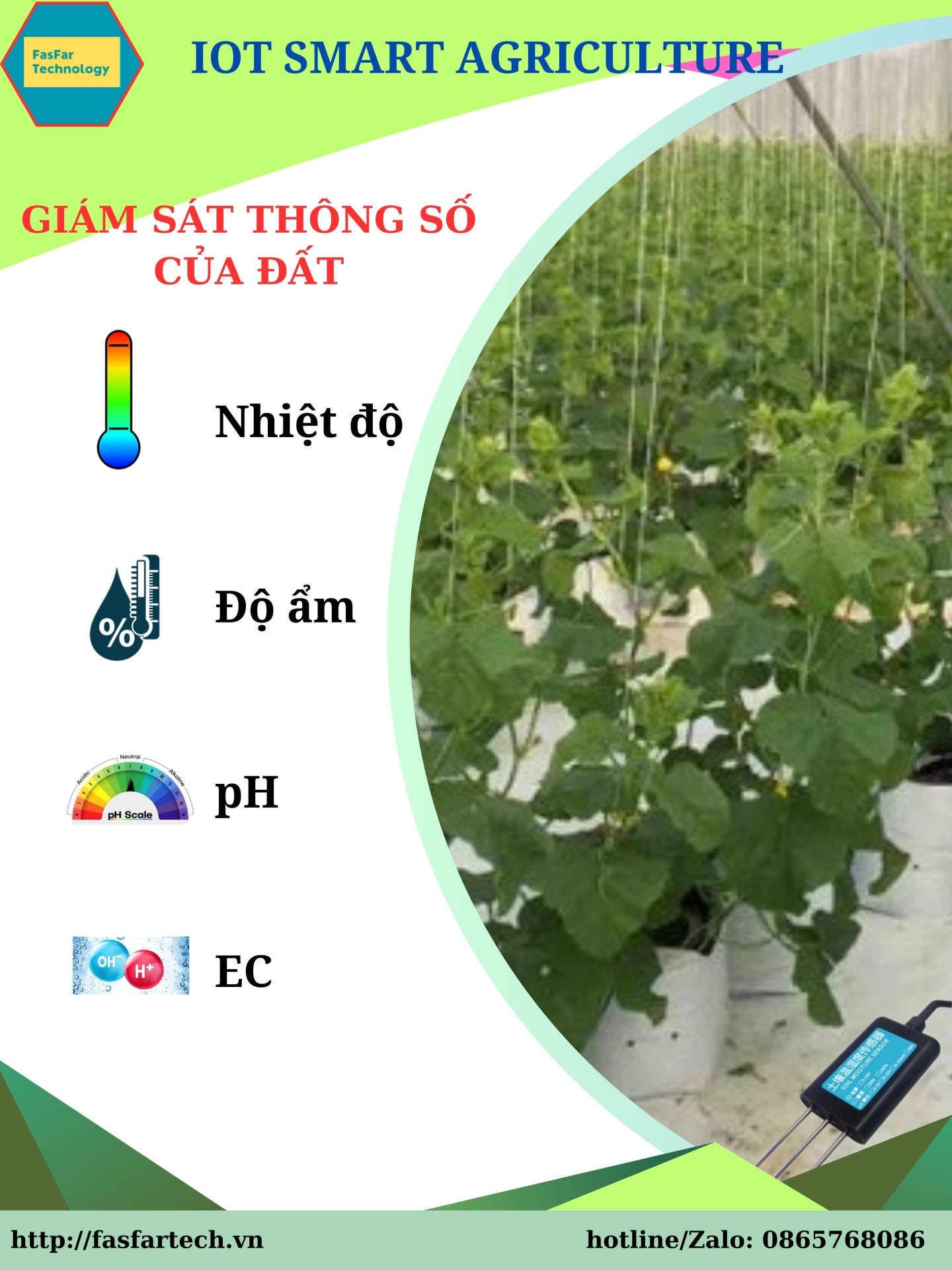 Hệ thống bao gồm các cảm biến nhận biết nhiệt độ, độ ẩm, Độ dẫn điện EC, pH của đất để có thể điều chỉnh thổ nhưỡng cho phù hợp với từng loại cây trồng.