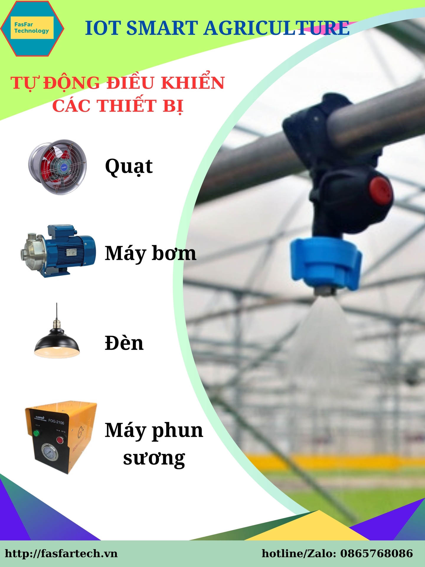 Hệ thống bao gồm giám sát, điều khiển các thiết bị: Máy bơm, thiết bị tưới nhỏ giọt, tưới phun sương, phun mưa, bộ châm phân,...