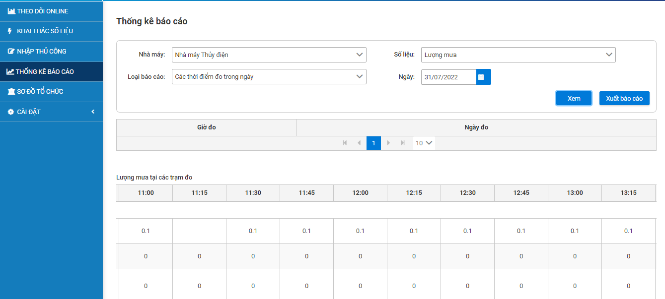 Dữ liệu của các trạm sẽ được hiển thị theo dạng bảng, ở đây có thể tải file báo cáo về máy tính để lưu trữ hoặc báo cáo thông số của các trạm đo trong một ngày nhất định.