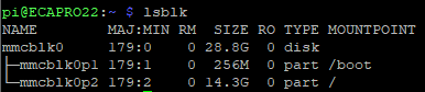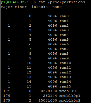 - cat /proc/partitions cho thấy kích thước và số lượng phân vùng trên thẻ SD hoặc ổ cứng.