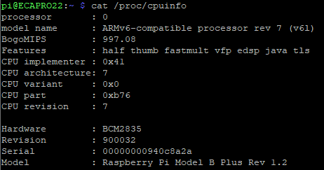 Lệnh này sẽ xuất thông tin về bộ xử lý của thiết bị. Chẳng hạn, nếu nhìn thấy BCM2708, nghĩa là chip được sản xuất bởi Broadcom.