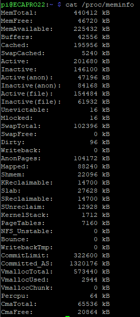 - cat /proc/meminfo hiển thị chi tiết về bộ nhớ Raspberry Pi.